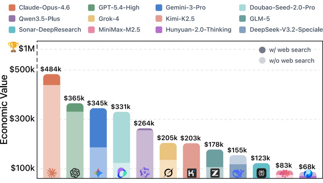 每个任务的经济价值,由完成该任务所需的专家耗时与权威市场时薪共同决定(时薪数据来源于中美官方统计及最新行业报告)。所有任务的总经济价值累计超过 100 万美元。这意味着,在现实世界中完成这套题目,需要支付百万美元级别的专家费用。而 AI 的表现,将直接以它 “能赚取多少美元” 来直观呈现。